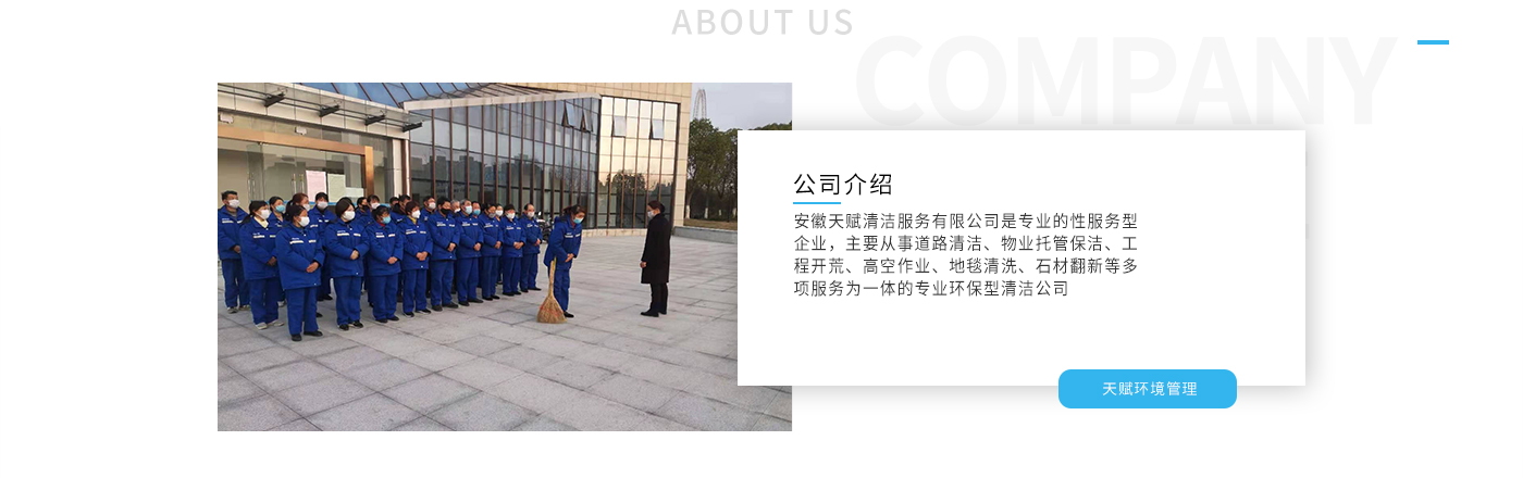 安徽天賦清潔服務(wù)有限公司是的服務(wù)型企業(yè),主要從事道路清潔、物業(yè)托管保潔、工程開荒、高空作業(yè)、地毯清洗、石材翻新等多項服務(wù)為一體的環(huán)保型清潔公司。公司管理機制完善,清潔作業(yè)經(jīng)驗豐富,擁有技術(shù)力量,嚴(yán)格實行崗前培訓(xùn)—崗中督查—上崗在培訓(xùn)的員工管理措施,憑著優(yōu)良的清潔質(zhì)量和嚴(yán)格的督查管理,為眾多企事業(yè)單位、醫(yī)院、酒店、廠區(qū)商場、物業(yè)、道路、學(xué)校、公園等提供后勤清潔服務(wù)。在業(yè)內(nèi)擁有良好的口碑。工作人員,服務(wù)態(tài)度優(yōu),竭力為客戶提供好的保潔服務(wù)。安徽天賦清潔服務(wù)有限公司:致力于長期合作關(guān)系,提高服務(wù)質(zhì)量,提供高標(biāo)準(zhǔn)的清潔服務(wù)。公司的經(jīng)營理念:為營造一個更清潔、亮麗的生活和工作環(huán)境而努力!“誠信”是公司成功保證?!翱蛻糁辽?,信譽為首”是公司宗旨。高標(biāo)準(zhǔn)提供服務(wù),維護客戶利益、形象,是我始終不渝的目標(biāo)。